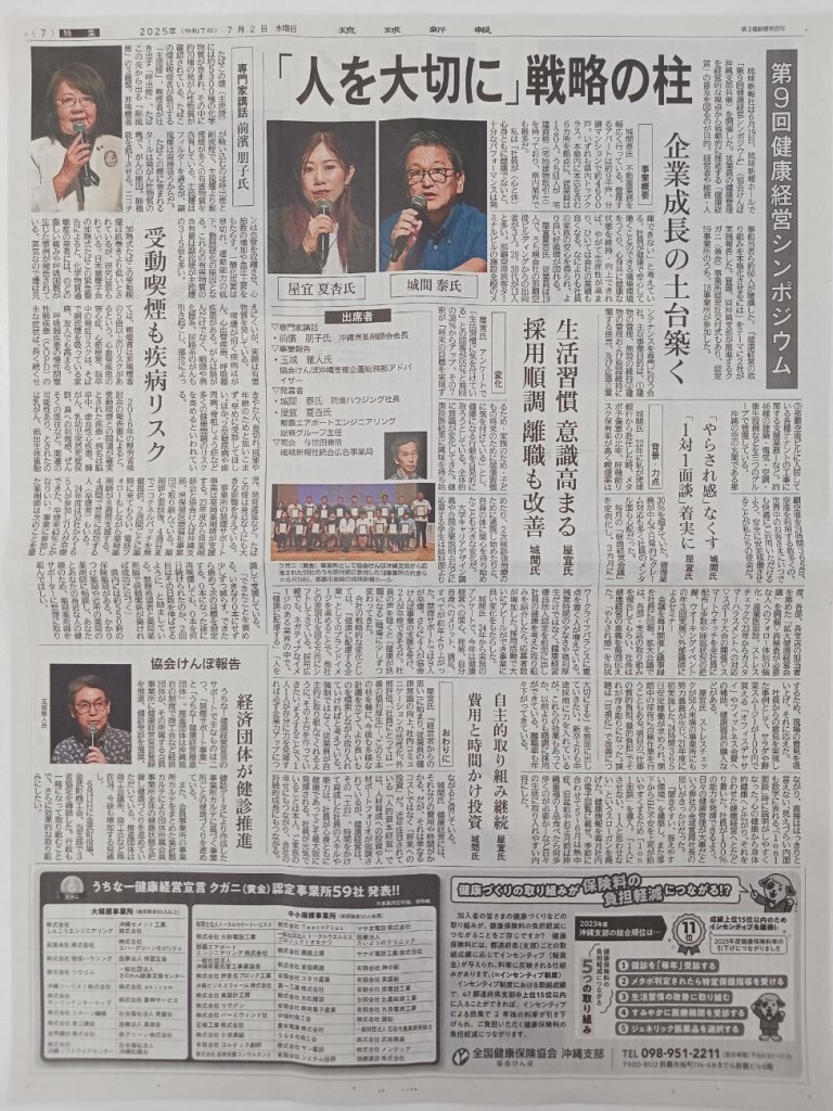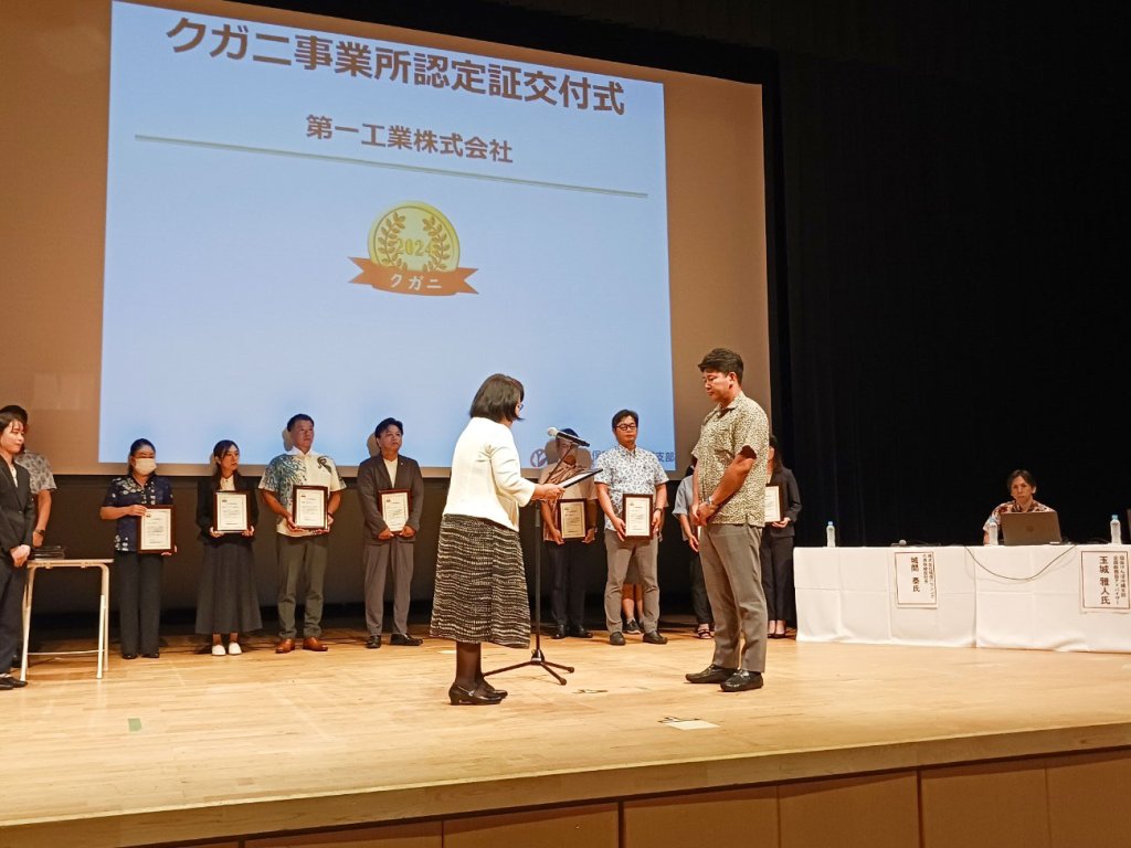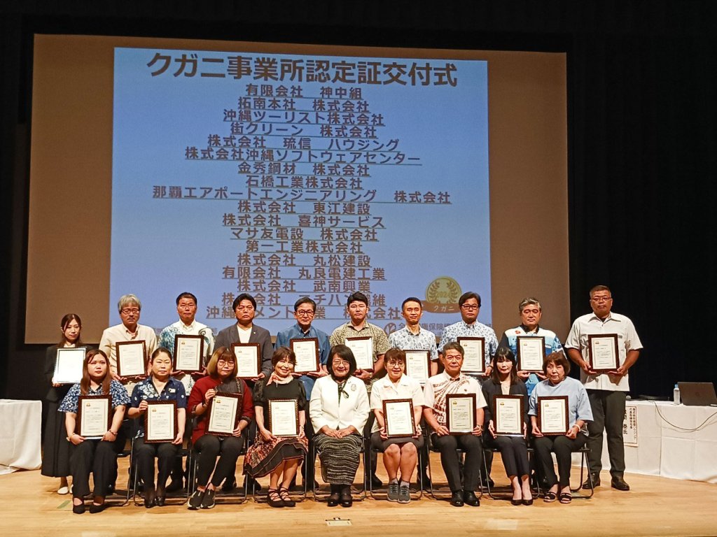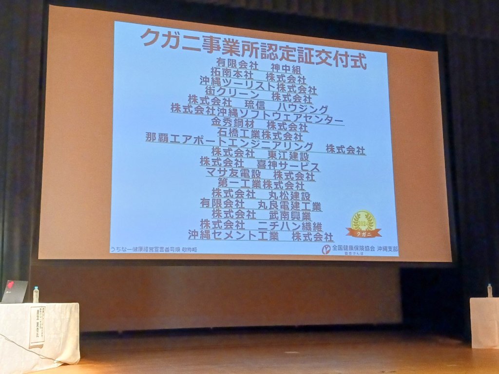 去った6月19日に開催された、第9回健康経営シンポジウムの冒頭に「クガニ事業所認定証交付式」が行われ、会社を代表して比嘉取締役工事部長が出席し認定証を頂きました。